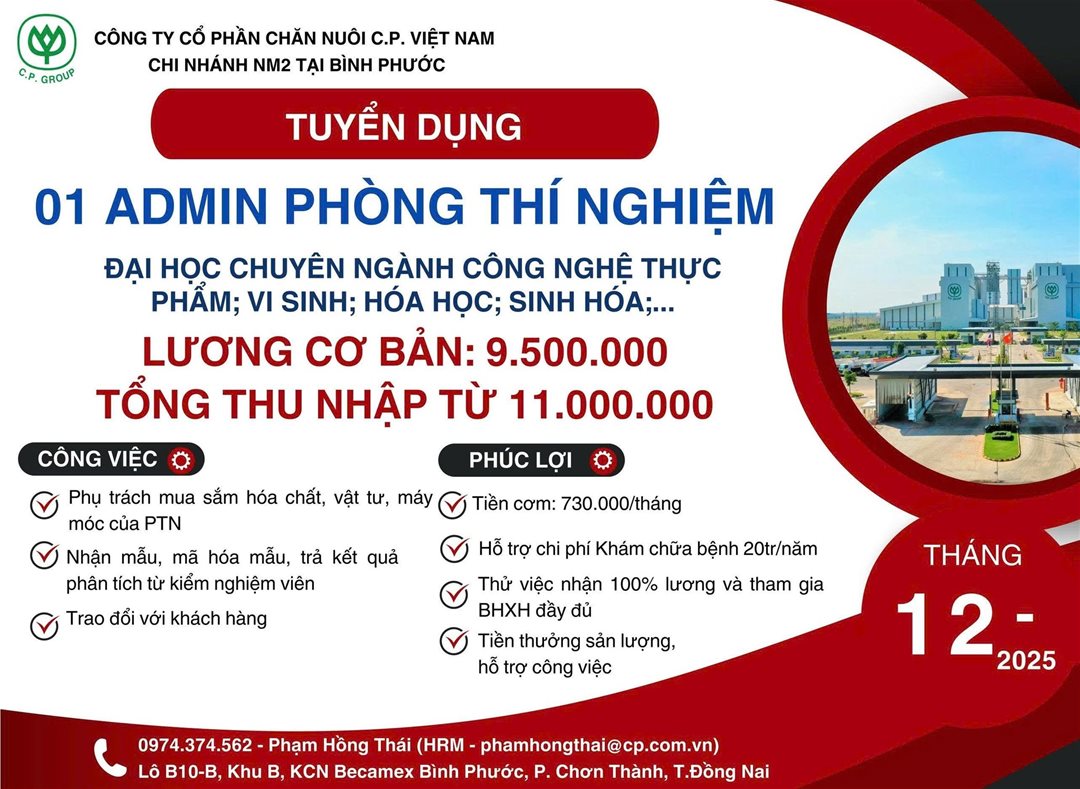 Công Ty Cổ Phần Chăn Nuôi C.P Việt Nam thông báo tuyển dụng nhân viên phòng thí nghiệm chuyên ngành Công nghệ thực phẩm