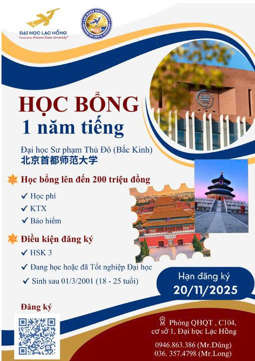 Sinh viên cơ hội nhận học bổng toàn phần 1 năm tiếng Trung (03/2026 – 01/2027) tại Đại học Sư phạm Thủ đô Bắc Kinh, một trong những trường đại học danh tiếng thuộc nhóm “Song Nhất Lưu” của Trung Quốc.