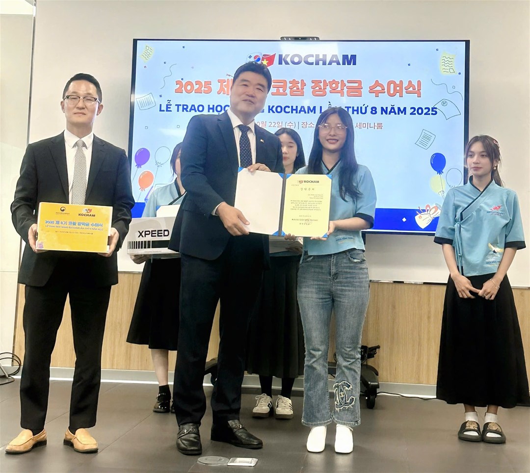 On October 20, 2025, the Korean Chamber of Commerce and Industry (KoCham) awarded four scholarships, each worth VND 5 million, to four outstanding students of LHU. This marks the eighth consecutive year KoCham has organized the Scholarship Award Ceremony to honor and encourage Vietnamese students majoring in Korean Studies.