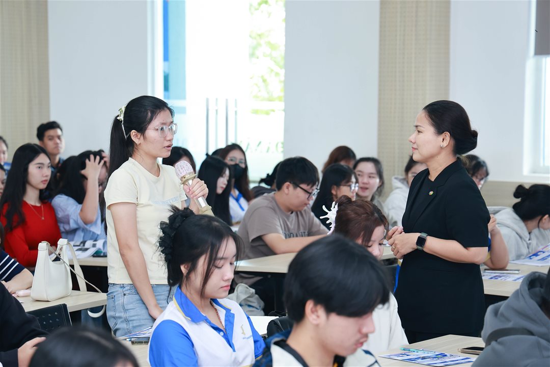 Đại diện FPT Long Châu Bà Võ Thị Kim Hồng – Phó Giám đốc Nhân sự đã chia sẻ nhiều câu chuyện thực tiễn xoay quanh cơ hội nghề nghiệp trong ngành dược, xu hướng phát triển của lĩnh vực này, đồng thời cung cấp những kinh nghiệm hữu ích giúp sinh viên định hướng lộ trình nghề nghiệp ngay từ năm đầu đại học.